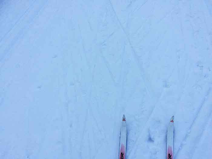 The scene was so tremendously beautiful, with snow covered trees and the path, darkness, and the Moon shining above, distant view of higher mountains, so the little trouble of dark elements of the path, when the trees covered the moon, did not seem to be a problem. I continued running, and the suddenly, due to darkness while rushing, I put one ski over the other and fell.